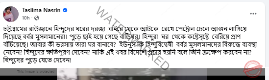 ‘চট্টগ্রামের রাউজানে হিন্দুদের ঘরের দরজা বাইরে থেকে আটকে রেখে পেট্রোল ঢেলে আগুন লাগিয়ে দিয়েছে বর্বর মুসলমানেরা। পুড়ে ছাই হয়ে গেছে বাড়িঘর। হিন্দুরা ঘর থেকে কষ্টেসৃষ্টে বেরিয়ে প্রাণ বাঁচিয়েছে। আবার কী ভরসায় তারা ঘর বানাবে? ইউনুস কি হিন্দুবিদ্বেষী বর্বর মুসলমানদের বিরুদ্ধে ব্যবস্থা নেবেন? হিন্দুদের ক্ষতিপূরণ দেবেন? নাকি এই খবর বিদেশে প্রচার হয়নি বলে তিনি ভ্রুক্ষেপ করবেন না? হিন্দুদের পুড়ে যেতে দেবেন!’