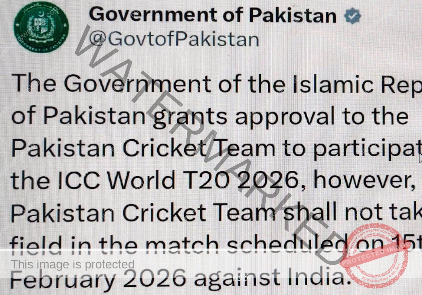 আমুদরিয়া নিউজ : পাকিস্তান আসন্ন টি টুয়েন্টি বিশ্বকাপে অংশ নিলেও আগামী ১৫ ফেব্রুয়ারি ভারতের বিরুদ্ধে ম্যাচ খেলবে না বলে জানিয়ে দিয়েছে সে দেশের সরকার। রবিবার পাকিস্তান সরকারের এক্স হ্যান্ডলে ওই বিবৃতি দেওয়া হয়েছে। সেখানে জানানো হয়েছে, পাক সরকার আইসিসি টি টুয়েন্টি বিশ্বকাপে অংশগ্রহণের জন্য পাকিস্তান ক্রিকেট দলকে অনুমোদন দিয়েছে। তবে ১৫ ফেব্রুয়ারি ভারতের বিপক্ষে নির্ধারিত ম্যাচে পাকিস্তান ক্রিকেট দল মাঠে নামবে না বলে বিজ্ঞপ্তিতে জানানো হয়েছে। তা হলে দুই দল পরে পয়েন্ট টেবিলে মুখোমুখি হলে কী হবে তা নিয়েই এখন আলোচনা শুরু হয়েছে।